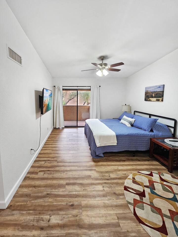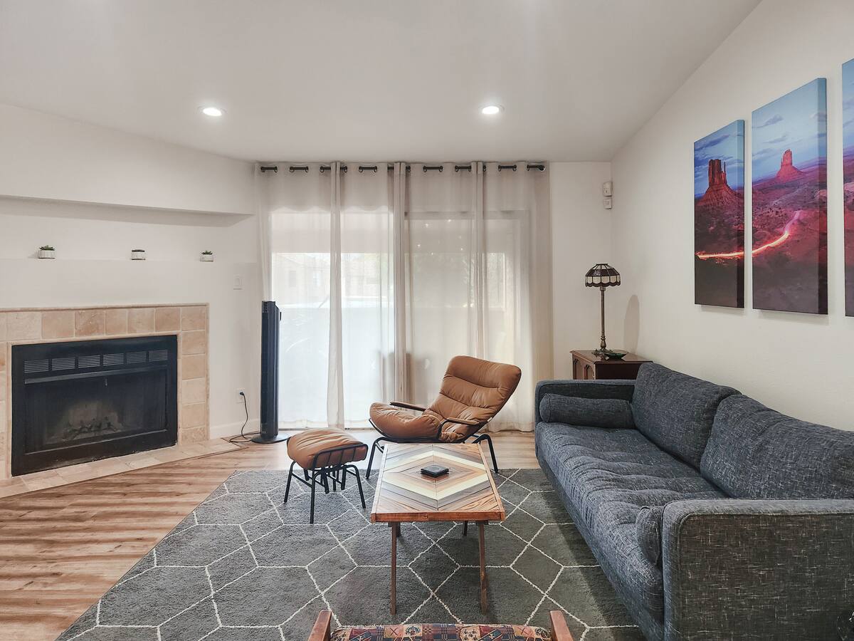 Step into your serene Scottsdale retreat! This charming 2-bed, 2-bath condo boasts over 1,200 sq ft of space, ideal for up to 6 guests. Enjoy a king bed in the master, a queen in the second room, and a queen air mattress for added comfort. Dive into the heated community pool, available year-round. Welcome to your desert oasis!